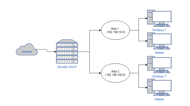 Tenemos dos redes distintas, y queremos que nuestro servidor DHCP administre y centralice cada una de las IP de cada red dividiéndolo en dos ámbitos distintos. Una red tiene la IP 192.168.10.0 y la otra tiene la IP 192.168.100.0, ambas con máscara de red /24 y queremos que ambas salgan a internet.