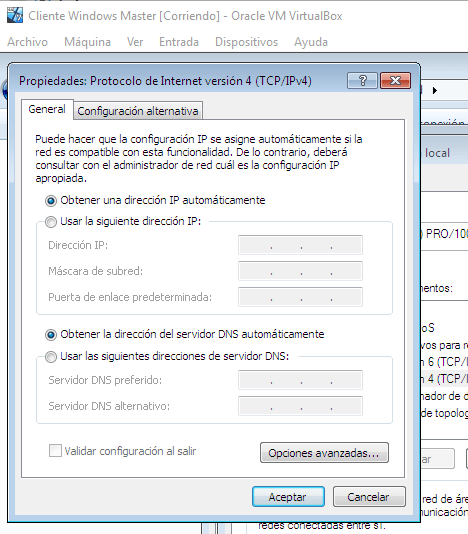 Iniciaremos los clientes para comprobar si funciona, pero antes de eso tendremos que configurar los clientes de forma que reciban su configuración de red por DHCP: