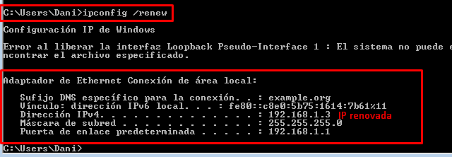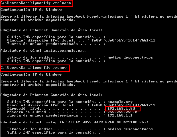 Una vez hecho esto, en el cliente Windows soltamos la IP con «ipconfig /release» y renovamos la ip con «ipconfig /renew» para ver si obtenemos la IP reservada: