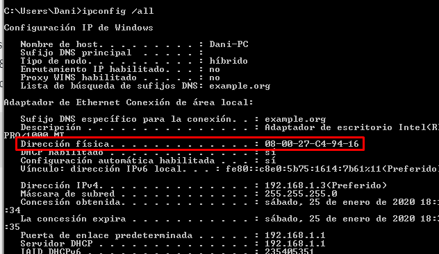 Para empezar vamos a asignarle una reserva a nuestro cliente Windows, en esto caso escogeremos la IP 192.168.1.50, así que primero tendremos que averiguar la MAC de nuestro cliente Windows, que se consigue con un: