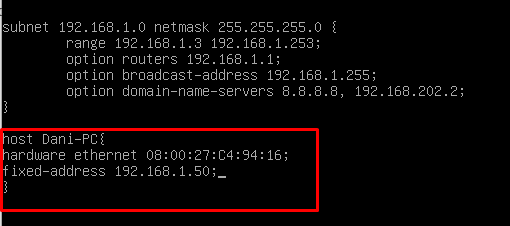 Nos dirigimos ahora a nuestro servidor DHCP, y editamos el fichero «/etc/dhcp/dhcpd.conf»,y añadimos lo siguiente: