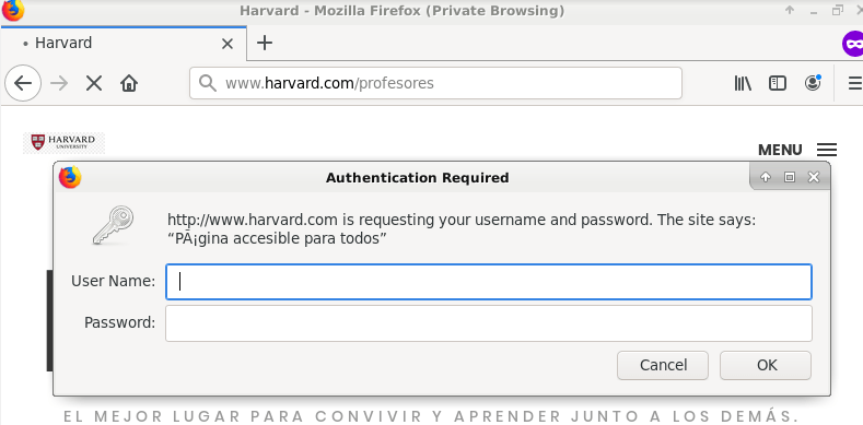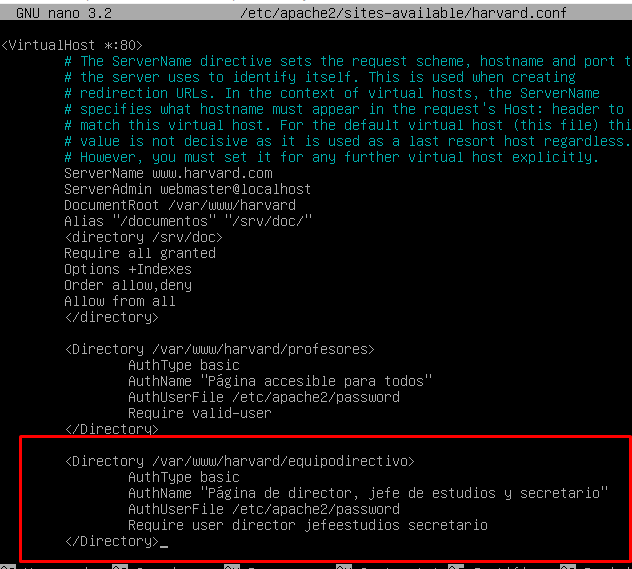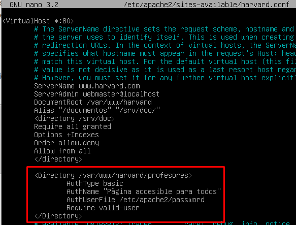 Para activar la autenticación básica nos tenemos que dirigir hacia /etc/apache/sites-available/harvard.conf y editar ese fichero: