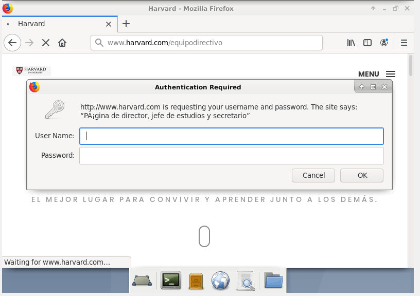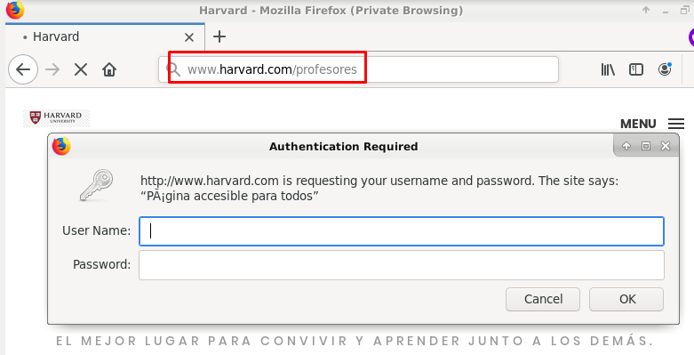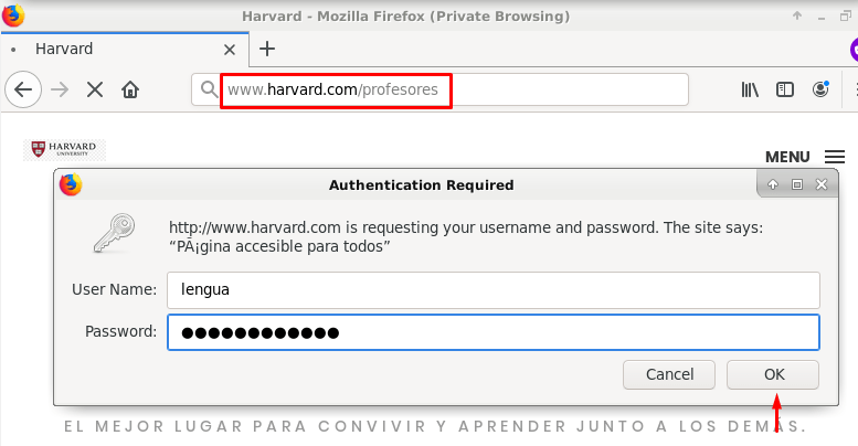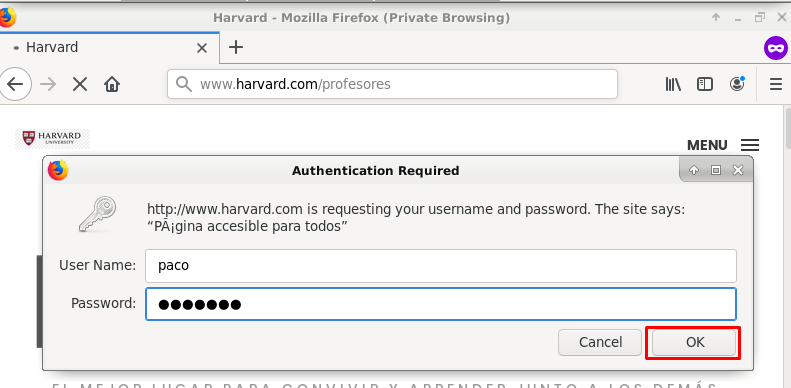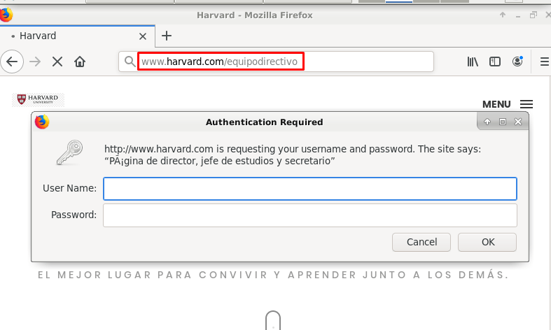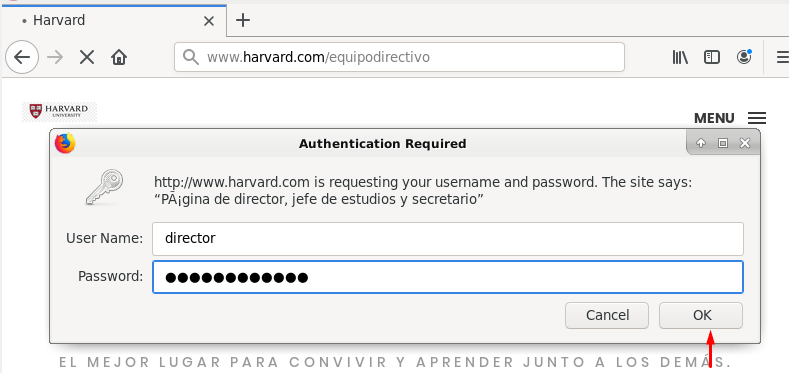 Como era de esperar, no nos deja con el usuario «lengua» porque aunque esté en el fichero «password», hemos configurado que solo puedan acceder el director, el jefe de estudios y el secretario, así que ahora probaremos con alguno de ellos: