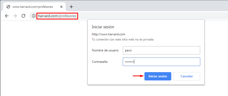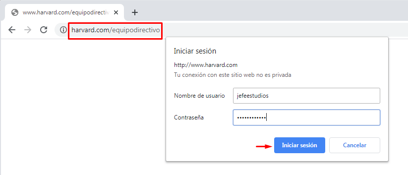 Queremos que un grupo de usuarios (director,jefe de estudios,secretario,lengua,mates etc) tengan determinados permisos para acceder o no a un sitio web,entonces tenemos que habilitar la «Autenticación básica» en nuestro servidor web, que obligará a realizar un inicio de sesión (logueo) en el que solo acepte a los usuarios permitidos en ese sitio web.