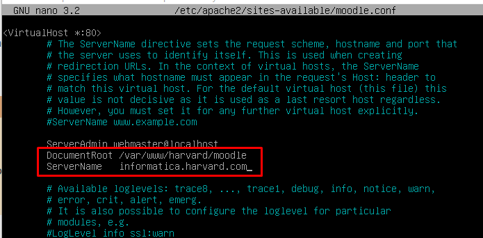 Ya tenemos nuestro archivo «moodle.conf» creado así que entraremos a editar el fichero para configurar el virtual host: