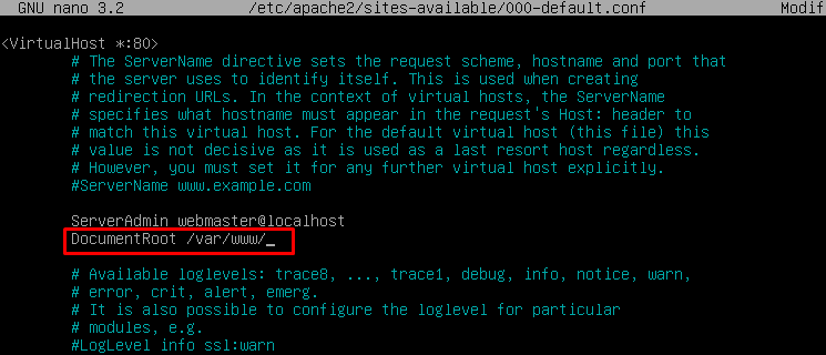 Guardamos y nos dirigimos a editar el fichero «000-default.conf» y nos aseguramos de que esté tal que así: