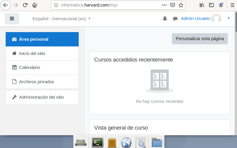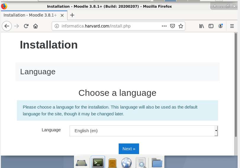 Nos dirigimos al cliente para instalar la moodle ya que nuestro servidor no dispone de entorno gráfico, pero eso no es problema porque simplemente accediendo al sitio web que hemos habilitado justo en los pasos anteriores con un cliente, la podremos instalar, así que iniciamos el cliente y buscamos en el navegador «informatica.harvard.com»: