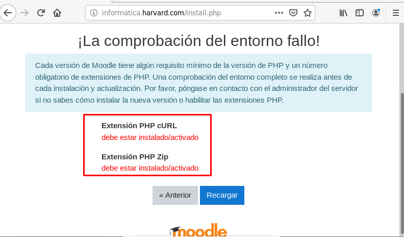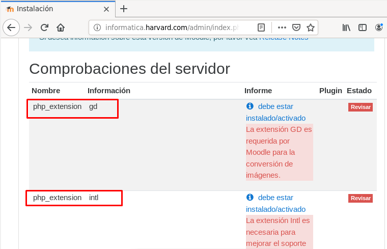 Nos dice que nos faltan dos paquetes por instalar relacionados con «php», así que nos dirigimos al servidor y los instalamos: