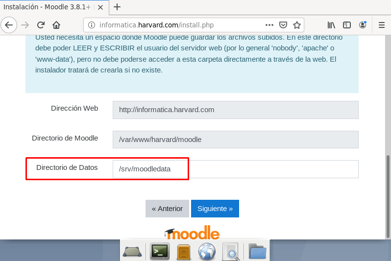 Ahí estará alojada la moodle, pero los datos de la moodle los vamos a alojar en otro directorio (/srv/moodledata), así que vamos a preparar el directorio para cuando nos pidan la ruta: